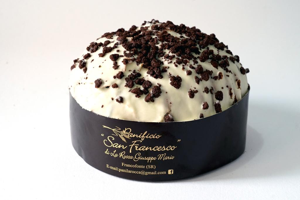 Panettone artigianale con gocce di cioccolato e pera candita ricoperto di cioccolato bianco e croccantini di cioccolato, incartato a mano.